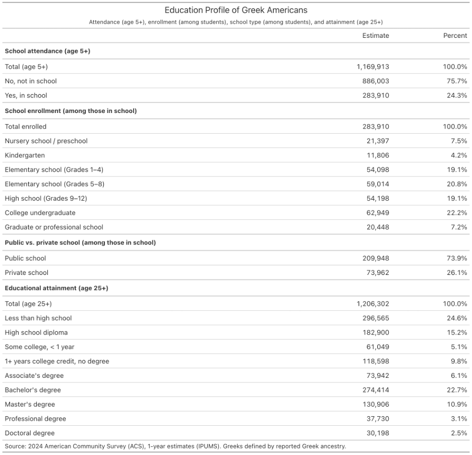 This post provides a brief descriptive snapshot of Greek Americans using data from the 2024 American Community Survey (ACS) 1-year estimates. The goal is to document what the data show about the basic sociodemographic composition and housing patterns of the Greek-American population in the United States. The ancestry question is used to define Greek-Americans. This post does not attempt to provide a definitive definition of Greek-American identity or to explain why these patterns exist.