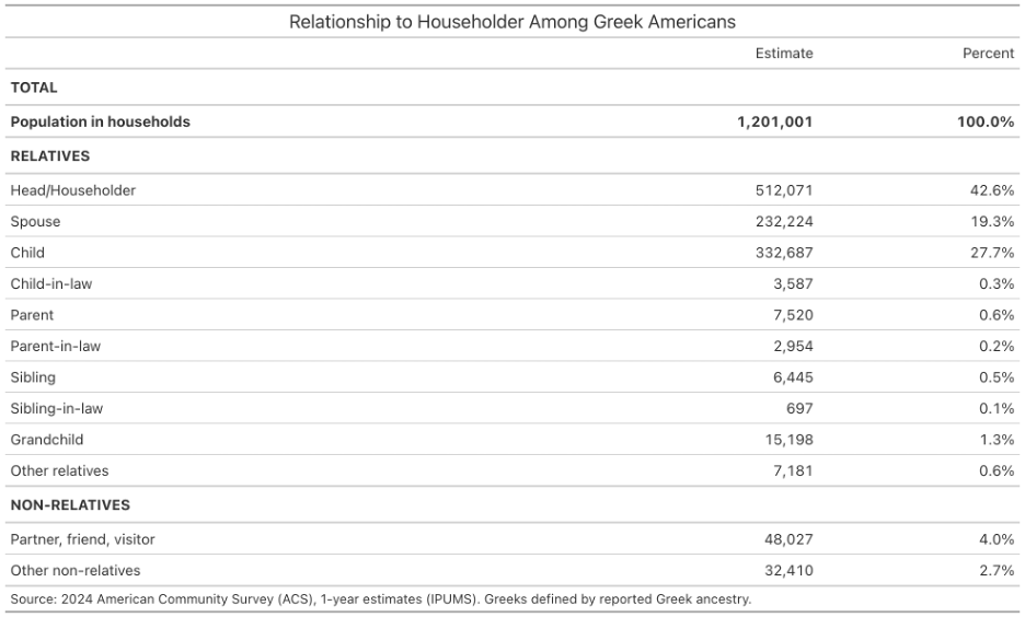 Table 6 shows who people are within Greek-American households. Most household members are householders, spouses, or children, who together account for approximately 90% of the total. Children make up just over one-quarter of all household residents, while spouses account for about one-fifth. Smaller shares consist of parents, siblings, grandchildren, and other relatives. Non-relatives, such as partners, friends, or visitors, constitute a relatively small share of residents in Greek-American households.