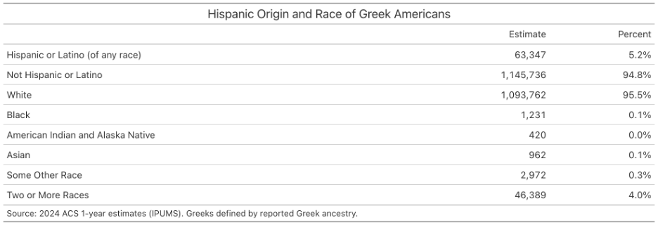 Table 2 presents the Hispanic origin and racial composition of Greek Americans. The overwhelming majority (about 96%) reports being non-Hispanic and White. Smaller shares identify as Hispanic (5%) or as belonging to two or more races (4%).